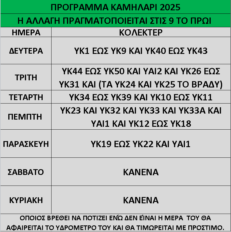 ΚΑΜΗΛΑΡΙ ΠΡΟΓΡΑΜΜΑΤΑ ΑΡΔΕΥΣΗΣ 07 Νοεμβρίου 2018 Εμφανίσεις: 5768 ΚΑΜΗΛΑΡΙ ΠΡΟΓΡΑΜΜΑ 2025 ΕΧΕΙ ΝΕΡΟ ΚΑΘΗΜΕΡΙΝΑ Προηγούμενο Επόμενο