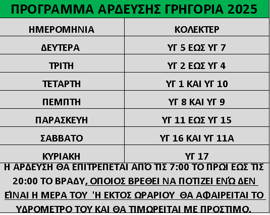 ΓΡΗΓΟΡΙΑ ΠΡΟΓΡΑΜΜΑΤΑ ΑΡΔΕΥΣΗΣ 07 Νοεμβρίου 2018 Εμφανίσεις: 3821 ΓΡΗΓΟΡΙΑ ΠΡΟΓΡΑΜΜΑ 2025 Προηγούμενο Επόμενο